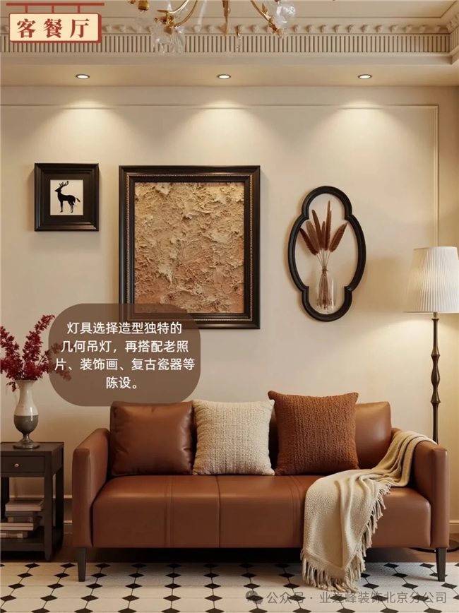 软装细节上,北京业之峰同样下足了功夫。复古花纹的地毯、几何图案的窗帘,搭配造型独特的几何吊灯与复古壁灯,共同烘托出一种难以言喻的怀旧氛围。而老照片、装饰画以及复古瓷器的点缀,更是让这个家充满了故事与温度。