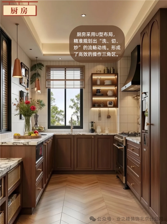 厨房区域,设计师采用了高效的U型布局,精准规划出“洗、切、炒”的流畅动线,形成了完美的操作三角区。这一设计不仅预留了充足的活动空间,更使得两人同时备餐成为可能,互不干扰,大大提升了烹饪的乐趣与效率。
